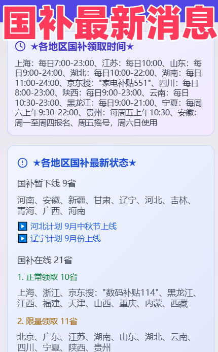 无疑是一场及时雨。举个例子,国补为什么抢不到了!2025年国补恢复后竣事时间终究确定为12月31日国补抢不到了是什么缘由?国补政策9月12日最新动静:新一轮国补9月恢复继续!家务间接减半!